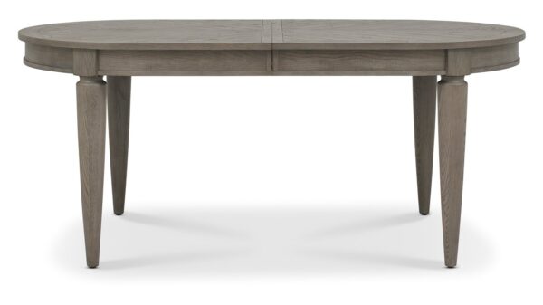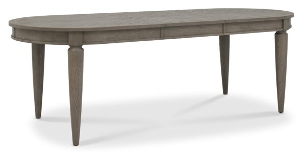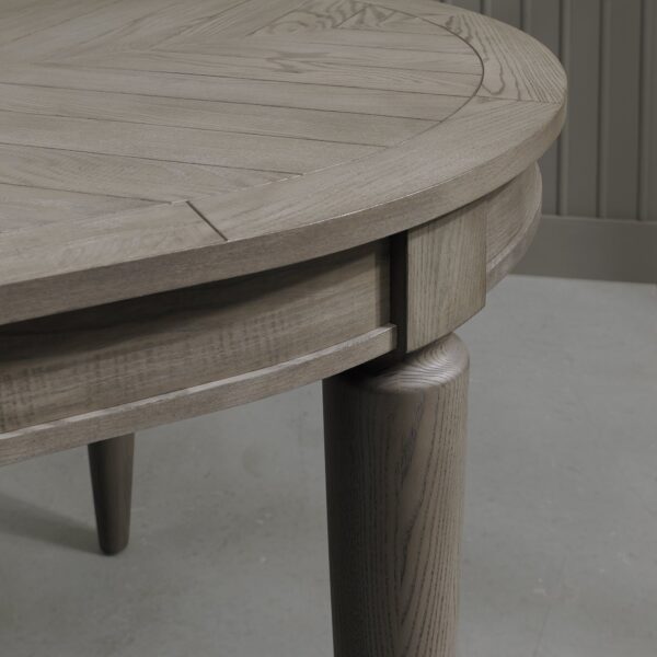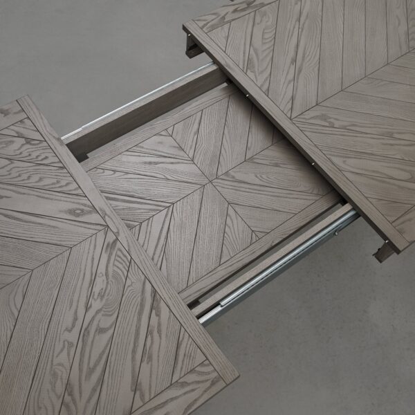 Atlas Silver Grey dining combines classic and contemporary styling to create timeless statement pieces for any home. Comprised of circular and lozenge-shaped forms, this range highlights on-trend, organic and flowing designs that provide a calming feel with softened edges and curves. This aesthetic is accentuated with saw-cut ash chevron pattern on the tables and cabinet tops which are finished in a fresh silver grey, and accompanied with matching turned tapering legs or contrasted with peppercorn powder coated metal frames. Slate grey fabric upholstered dining chairs and tambour doors complement this palette choice and add texture to pieces such as the sideboard and open display unit, whilst quality touches such as soft-closing runners speak to the craftsmanship and refinement of Atlas.