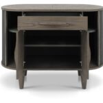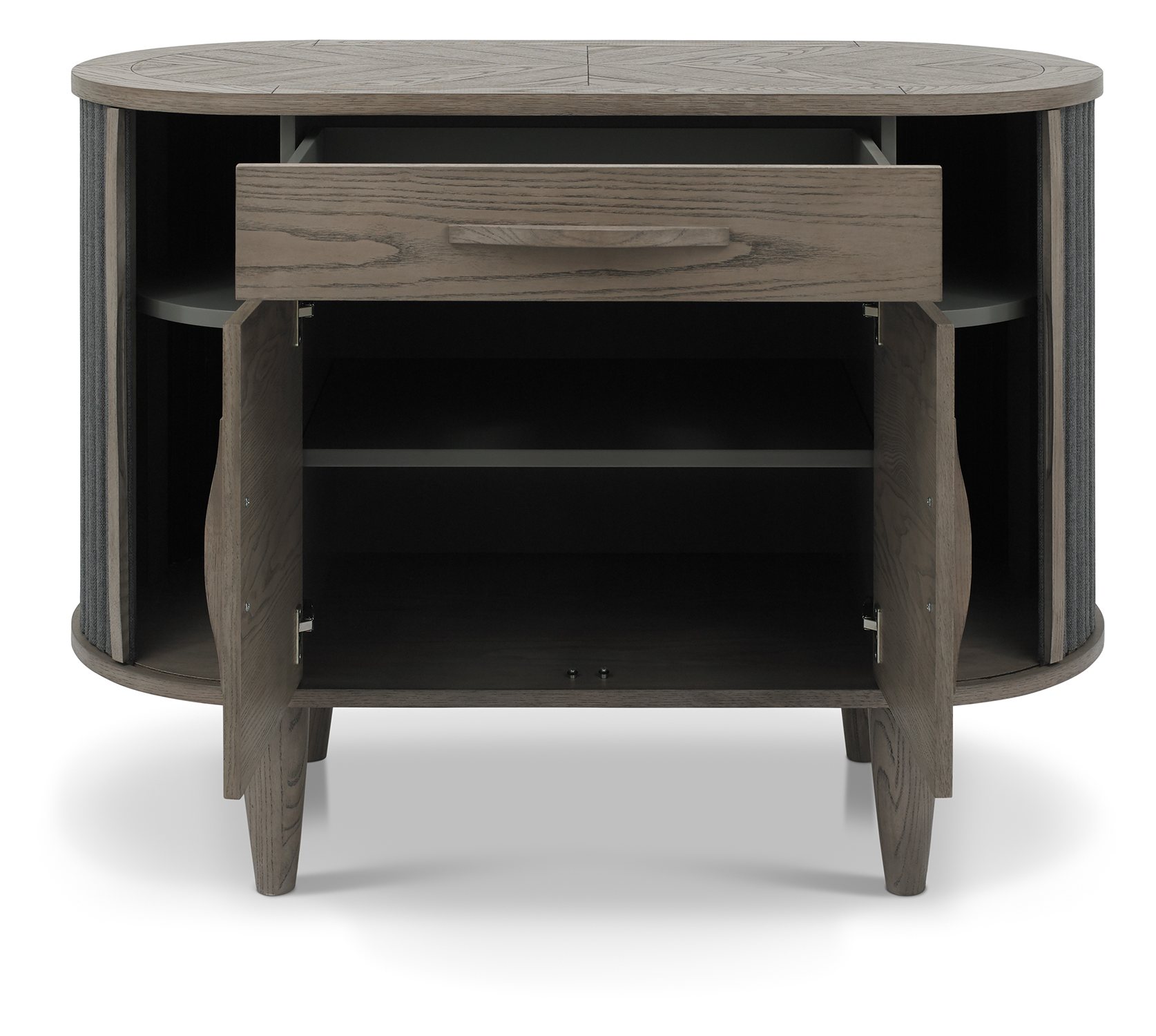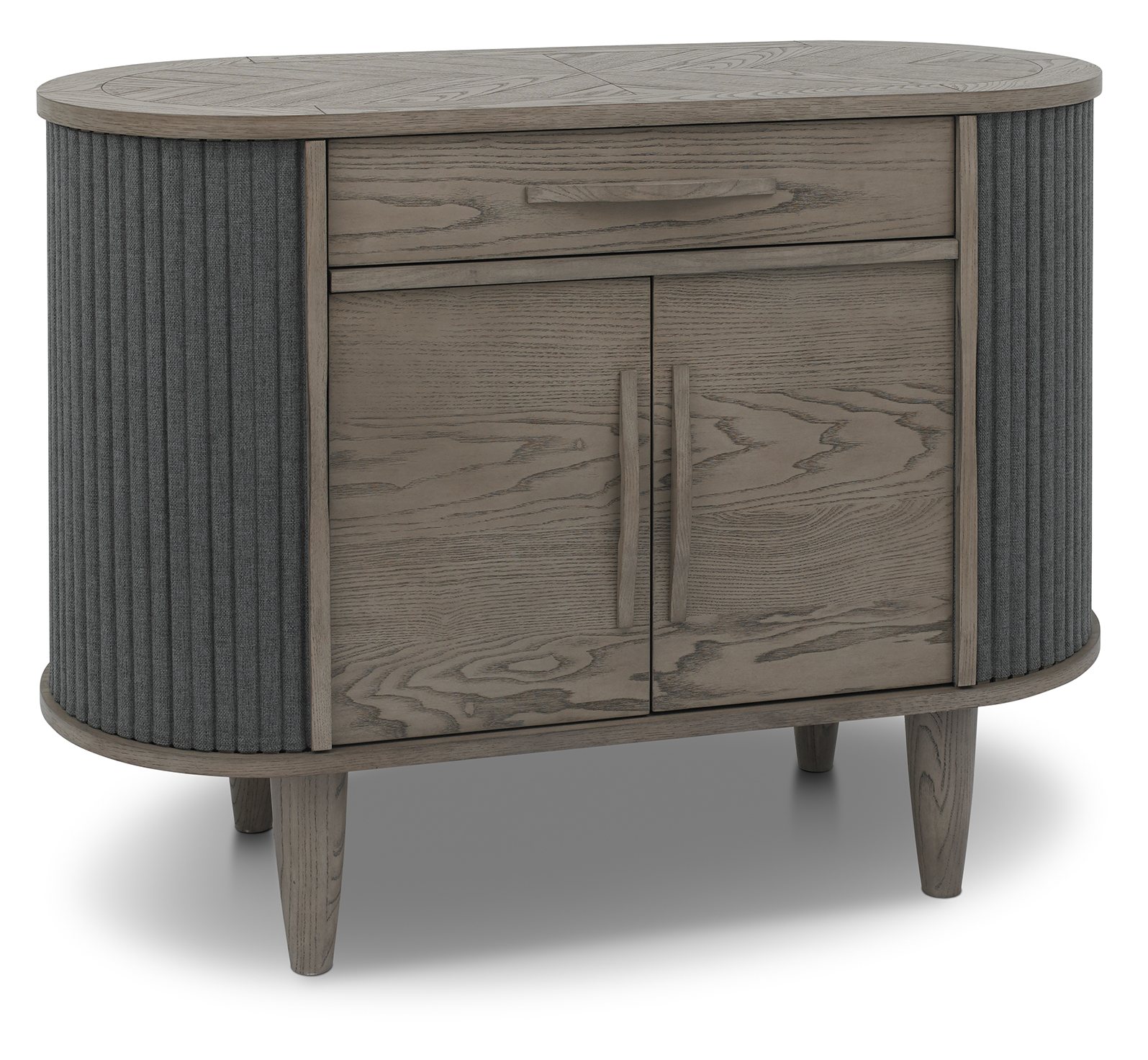 The Atlas Silver Grey Range combines classic and contemporary styling to create timeless statement pieces for any home. Comprising of circular and lozenge-shaped forms, this range highlights on-trend, organic and flowing designs that provide a calming feel with softened edges and curves. This aesthetic is accentuated with saw-cut ash chevron pattern on the tables, cabinet tops and display unit which are finished in a fresh silver grey, and accompanied with matching turned tapering legs or contrasted with peppercorn powder coated metal frames.