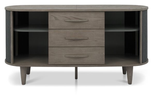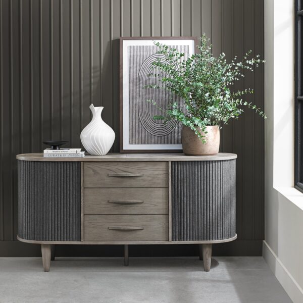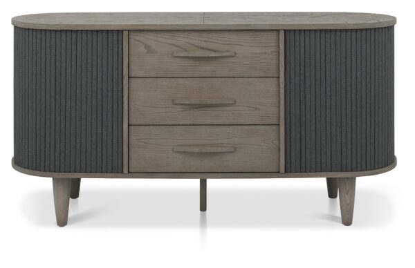 Atlas Silver Grey dining combines classic and contemporary styling to create timeless statement pieces for any home. Comprised of circular and lozenge-shaped forms, this range highlights on-trend, organic and flowing designs that provide a calming feel with softened edges and curves. This aesthetic is accentuated with saw-cut ash chevron pattern on the tables and cabinet tops which are finished in a fresh silver grey, and accompanied with matching turned tapering legs or contrasted with peppercorn powder coated metal frames. Slate grey fabric upholstered dining chairs and tambour doors complement this palette choice and add texture to pieces such as the sideboard and open display unit, whilst quality touches such as soft-closing runners speak to the craftsmanship and refinement of Atlas.