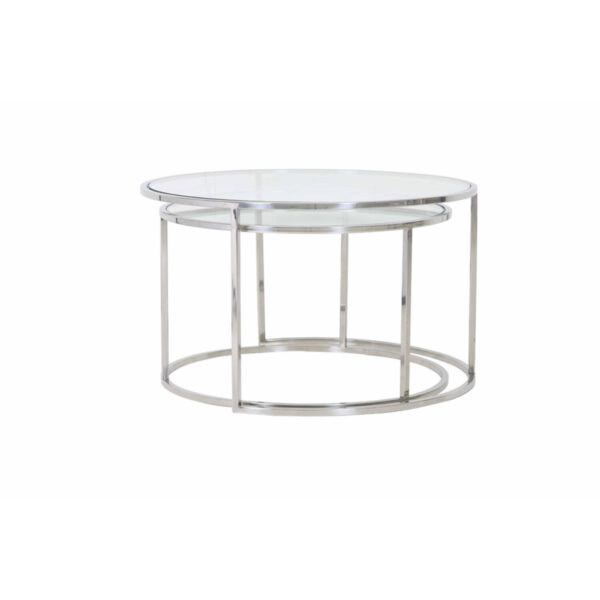 The Duarte Coffee Table Set of 2 in Glass and Nickel offers modern elegance with its sleek design. These tables feature clear glass tops and sturdy nickel frames, making them perfect for use in contemporary interiors. They can be used together or individually, providing versatile decor options. The Duarte Coffee Table Set adds a touch of sophistication to any living area.