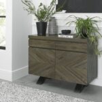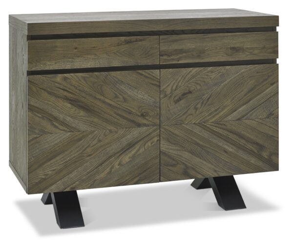 Ellipse Fumed Oak showcases bold design with a combination of the natural lines of the elliptical and circular tables, paired with the geometrical & linear shapes of the cabinet, to create a compelling and slightly eclectic look. The striking saw cut fumed rustic oak marquetry tops on the thick table tops and cabinet doors contrast beautifully against the large welded peppercorn powder coated metal bases, creating a range that successfully blends intricate craftsmanship and indulgently warm tones with an on trend industrial aesthetic. Each of these hand-crafted pattern tops and laminated fumed rustic oak cabinet frames are wire brushed and distressed to give a rustic look and tactile feel, making the most of the beautiful and varied grain of oak. Generously proportioned dining chairs, styled with diamond stitch upholstery in a choice of luxurious dark grey fabric and old west vintage bonded leather, feature plush padded seats, gently flared backs and elegantly tapering legs, imbuing comfort and indulgence. Superior Blum soft close drawer runners add that final quality detail to a range that is sure to be a focal point in any space.