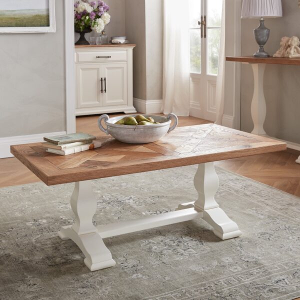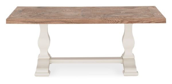 Glenart is a classically styled design contrasting an ivory painted finish with beautifully hand-crafted marquetry tops using American white oak solid timbers and veneers. Each piece of furniture reflects the intensified natural characteristics of rustic oak wood such as knots, mineral streaks, pinholes, sapwood, handplaning, saw marks and wood colour variation. These natural variations in colour, grain and random positioning of knots add to the attraction of the wood, resulting in an individuality that is unmatched by regular furniture. The range is completed with bold bespoke handles in a rich antique brass finish. BLUM soft closing drawers add that extra refinement to what is a timeless classic.