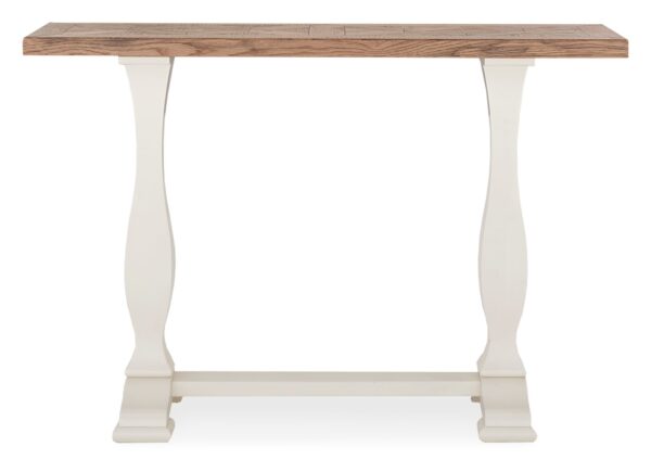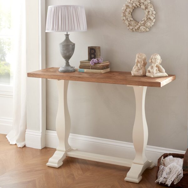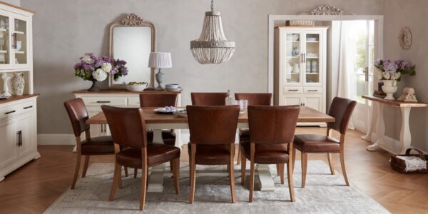 Boasting drama and sophistication in abundance., uncompromising design detail is found throughout the dining range in the serpentine framed tops, gently bow-fronted cabinets, classically styled turned legs, bespoke handles, intricate oak marquetry tops and large roll back upholstered chairs. The combination of striking oak tops contrasting with antique white pigment frames will ensure this range makes a bold statement in any home.