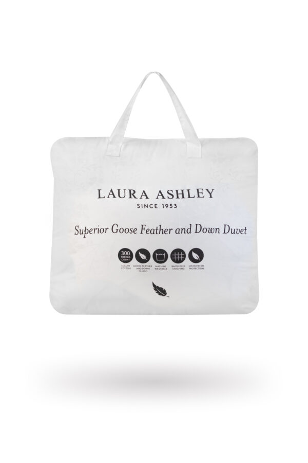 This beautiful Goose Feather and Down Duvet has Laura Ashley heritage jacquard cover, enveloping a superior blend of white goose feather and down filling. A truly sublime blend of design and quality to encourage a wonderful night’s sleep.The premium 300 thread count satin striped cover plays host to a superior filling of goose feather and down and 10.5 tog rating ensures that it’s great for year-round comfort. Microfresh protection provides lifelong freshness and it’s finished with piped edging as well as Laura Ashley branded embroidery for added elegance. Machine washable and comes in a reusable fabric bag for hygienic storage.