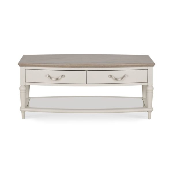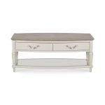 Montreux boasts drama and sophistication in abundance. Uncompromising design detail is found throughout the dining range in the serpentine framed tops, gently bow-fronted cabinets, classically styled turned legs, bespoke handles, intricate oak marquetry tops and large roll back upholstered chairs. The combination of striking oak tops contrasting with antique white pigment frames will ensure this range makes a bold statement in any home. Quality touches such as soft closing drawers for the cabinet and reciprocal extension runners for the dining tables embody the best of contemporary styling and everyday use.