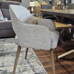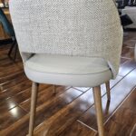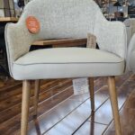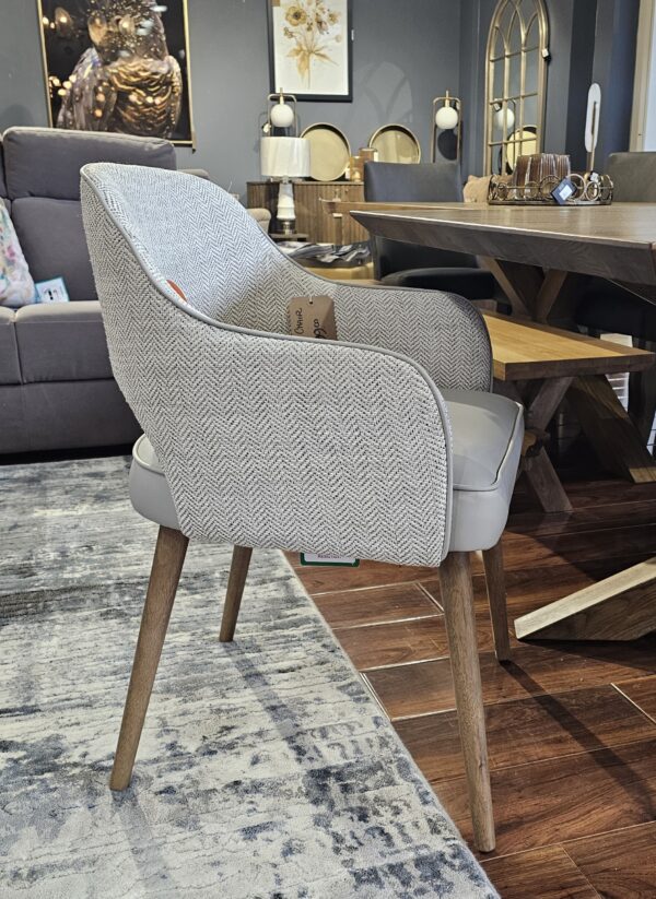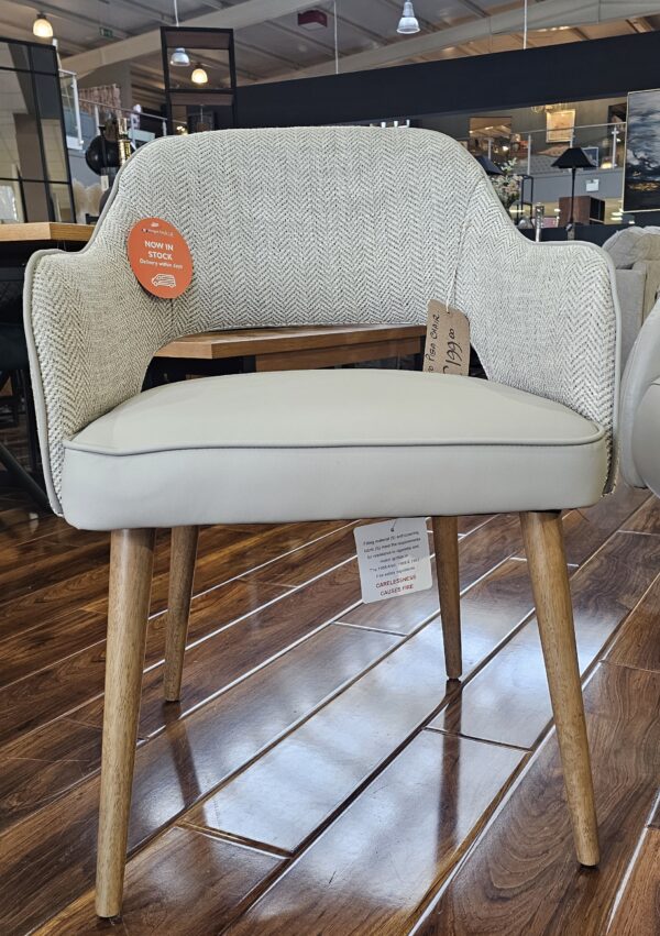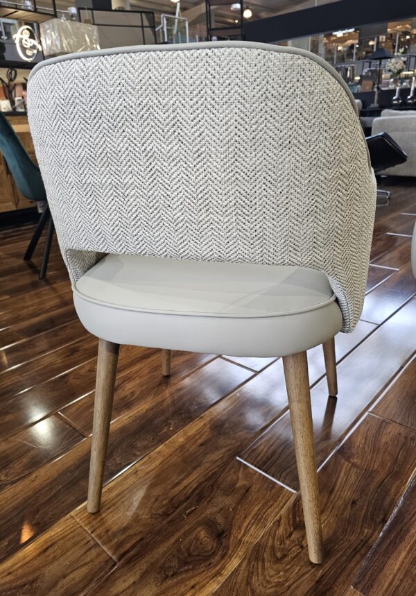 Our Pisa dining chair has now arrived and it is an ideal addition for seating in your living or dining space adding style and comfort. The rounded back rest with a cut out is upholstered in a chic cream herringbone fabric with ultra comfortable seat pads covered in a luxurious leatherette fabric. The sleek oak wood veneer legs in a Scandi design.