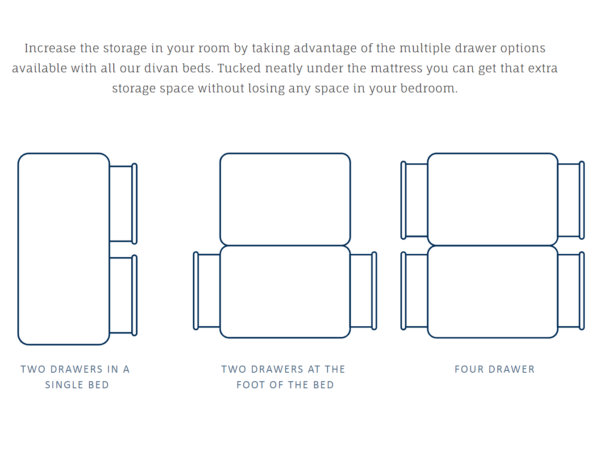 Respa’s divan offering helps you to form the solid foundation for your Respa mattress for the perfect night’s sleep. Using high-quality FSC Certified Scandinavian timber from sustainably managed forests. With options of adding a variety of 2 drawers and 4 drawer configurations for additional storage. Available Sizes: Single (3ft/90cm), Semi-double (4ft/120cm), Double (4ft 6 inches/135cm), King (5ft/150cm), Superking (6ft/180cm). Available in a wide variety of fabrics and colours.