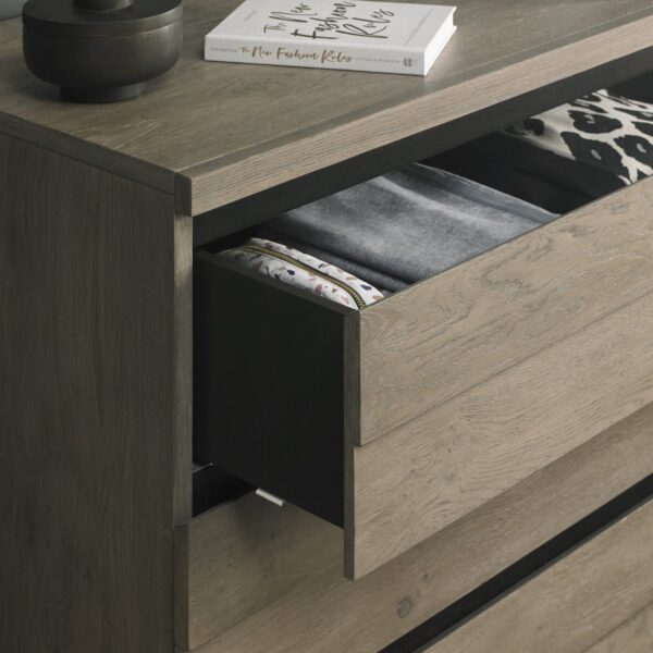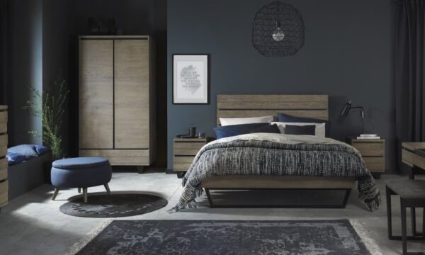 Tivoli is a contemporary and on-trend bedroom range incorporating a bold and striking mix of wire brushed rustic weathered oak with ebonised accent detailing and legs. Design features include staggered planking effect on the headboard & cabinet facia and unique tapering legs with fluting detail. Practical touches such as BLUM soft close drawer runners and a hide-away dressing table mirror makes Tivoli a compelling choice for the modern bedroom.