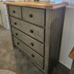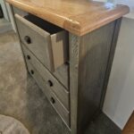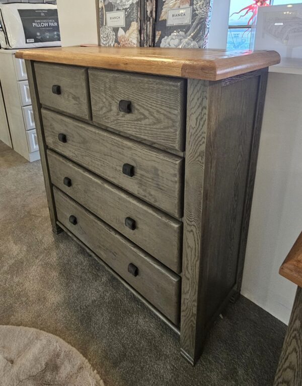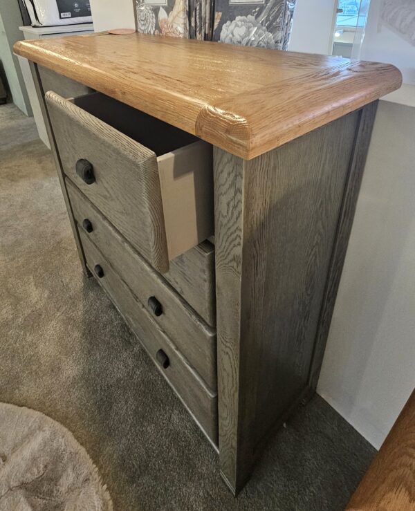 The aged grey finish is an ideal choice for that rustic feel which really accentuates the natural grain of this fabulous chunky oak with engravings carved into the bottom of each post. The handles are a dark metal which adds to that rustic theme. The Tops are solid oak with a light varnished finish to enhance and protect the natural oak wood.