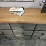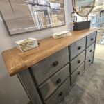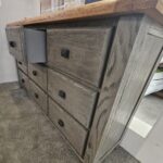 The aged grey finish is an ideal choice for that rustic feel which really accentuates the natural grain of this fabulous chunky oak with engravings carved into the bottom of each post. The handles are a dark metal which adds to that rustic theme. The Tops are solid oak with a light varnished finish to enhance and protect the natural oak wood.