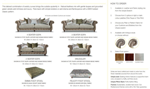 An elegant range from Alexander and James, Utopia’s tailored combination of swishy curves brings the outside opulently in. Natural leathers mix with gentle taupes and grounded green velvets add richness and luxury. Pare back with simple bolsters or add drama and flamboyance with a new twisted classic pattern.