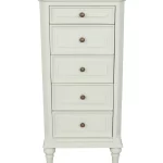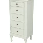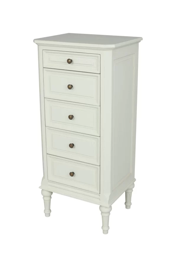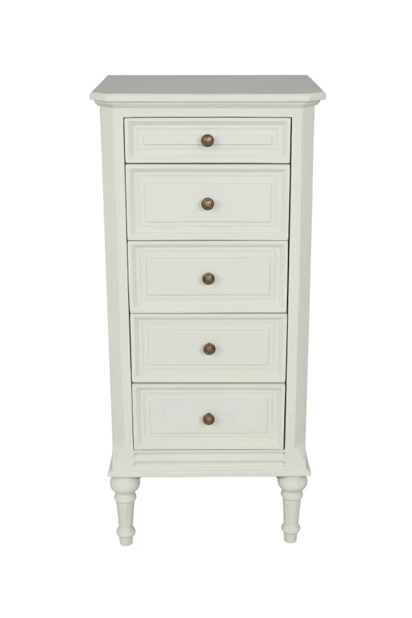 The Vanessa 5 Drawer Cabinet – the Tall Boy – traditional style, hand painted French collection. With its lovely curved and bow front sides making each piece different. Squared recessed legs and brass handles to add the finishing touches. Made frame solid and veneer woods, with tops in oak, hand painted in putty colour which is lightly distressed to give a genuine French look.