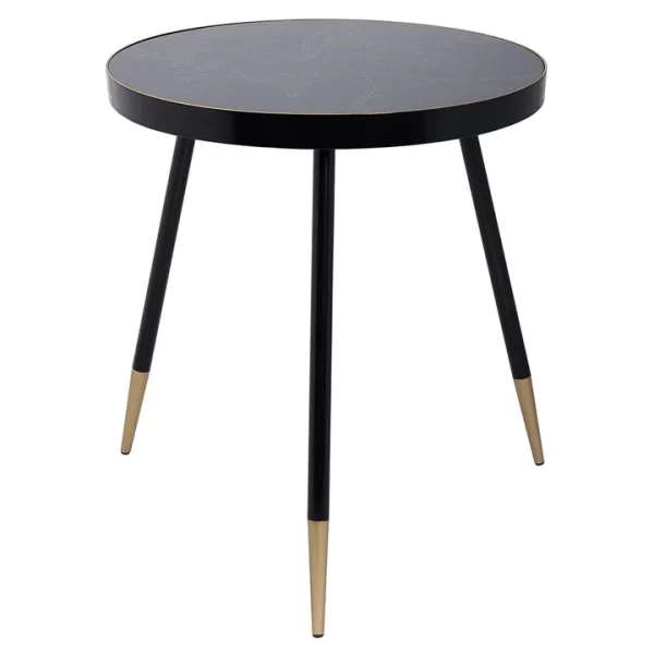 Black painted surround and leg with gold tip, 60cm diameter side table with black & antiqued gold world map pattern top with acrylic overlay. Can be styled solo or as part of a collaboration with the Palm, Bellatrix & Vega side tables for the ultimate styling effect. Dimensions: H 67cm W 60cm D 60cm