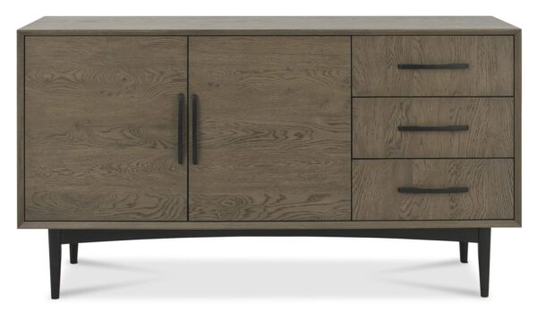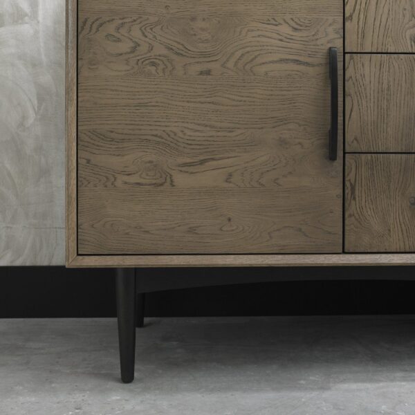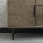 Taking inspiration from sophisticated mid-century styling through hints of both retro and Scandinavian design, Vintage is a fashionable range that features a varied blend of shapes and forms. Contrasting wire brushed weathered oak tops and carcasses with peppercorn painted base and legs are perfectly paired with a choice of upholstered chair styles in either a dark grey mottled fabric or an aged vintage bonded leather. Striking feature handles, engineered mitre joints, finely tapered legs, reciprocal extension runners and super comfortable casual chairs and stools made using moulded plywood shells with layers of foam encased in a ribbed look upholstery attest to the expert craftsmanship that underpins this collection. The natural shapes of the tables and radiused frames of the casual chairs and stools work with the geometrical and linear cabinet pieces to create a compelling and slightly eclectic blend. Vintage Dining boasts the perfect combination of inspired design with beauty and simplicity matched with craftsmanship, comfort and functionality.